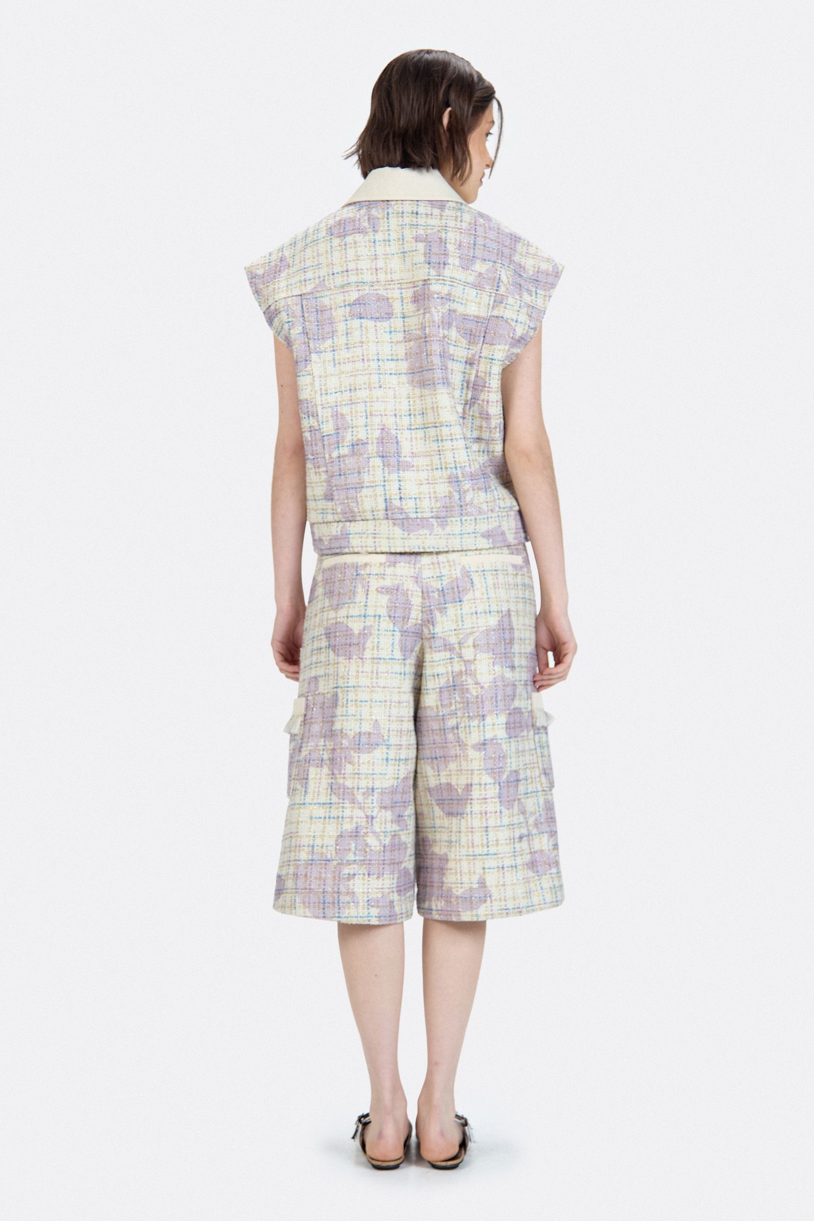 Chaleco confeccionado en tweed con print exclusivo de Maria Paez para esta colección. Fit relaxed, con hombros anchos con estructura y bolsillos plaqué en el frente. Interior forrado en acetato. Con acceso central mediante cierre y avíos metálicos personalizados.