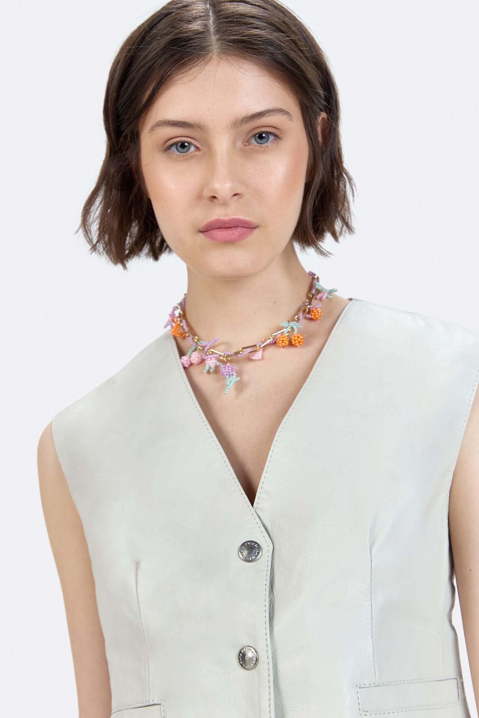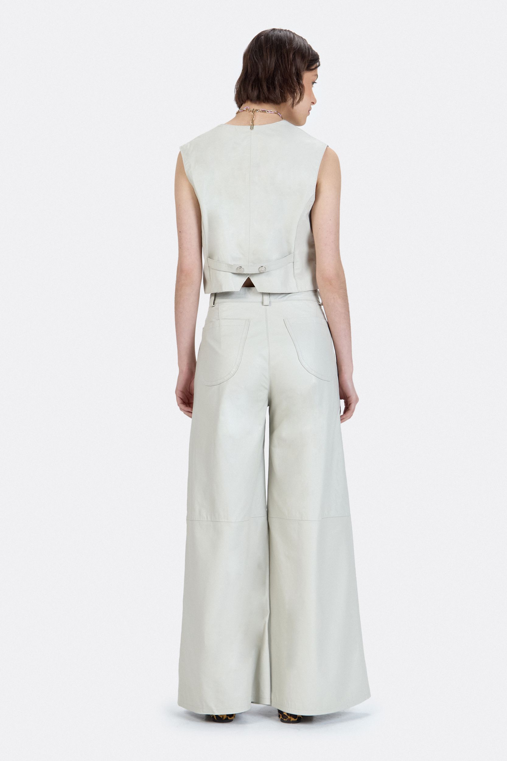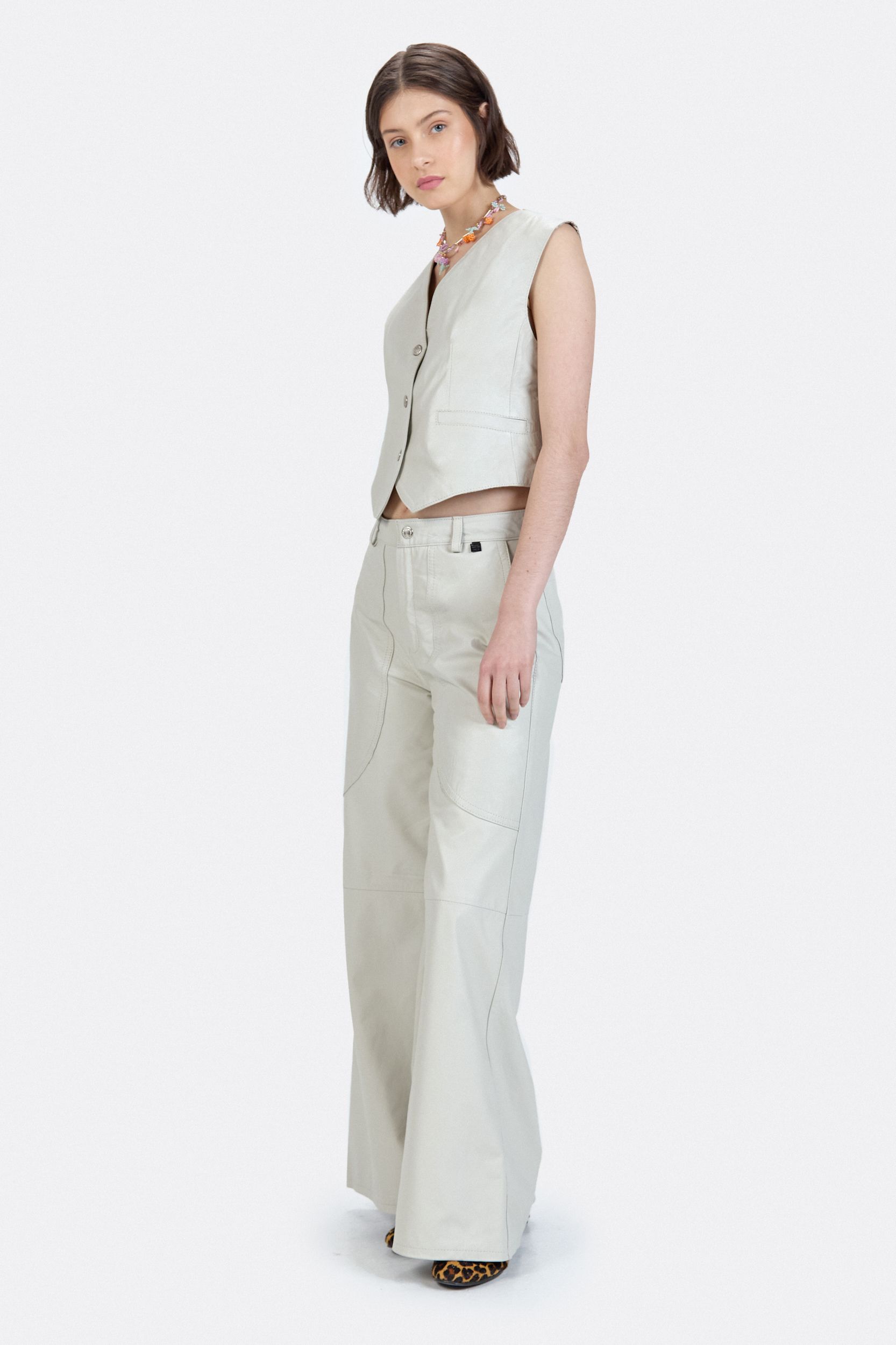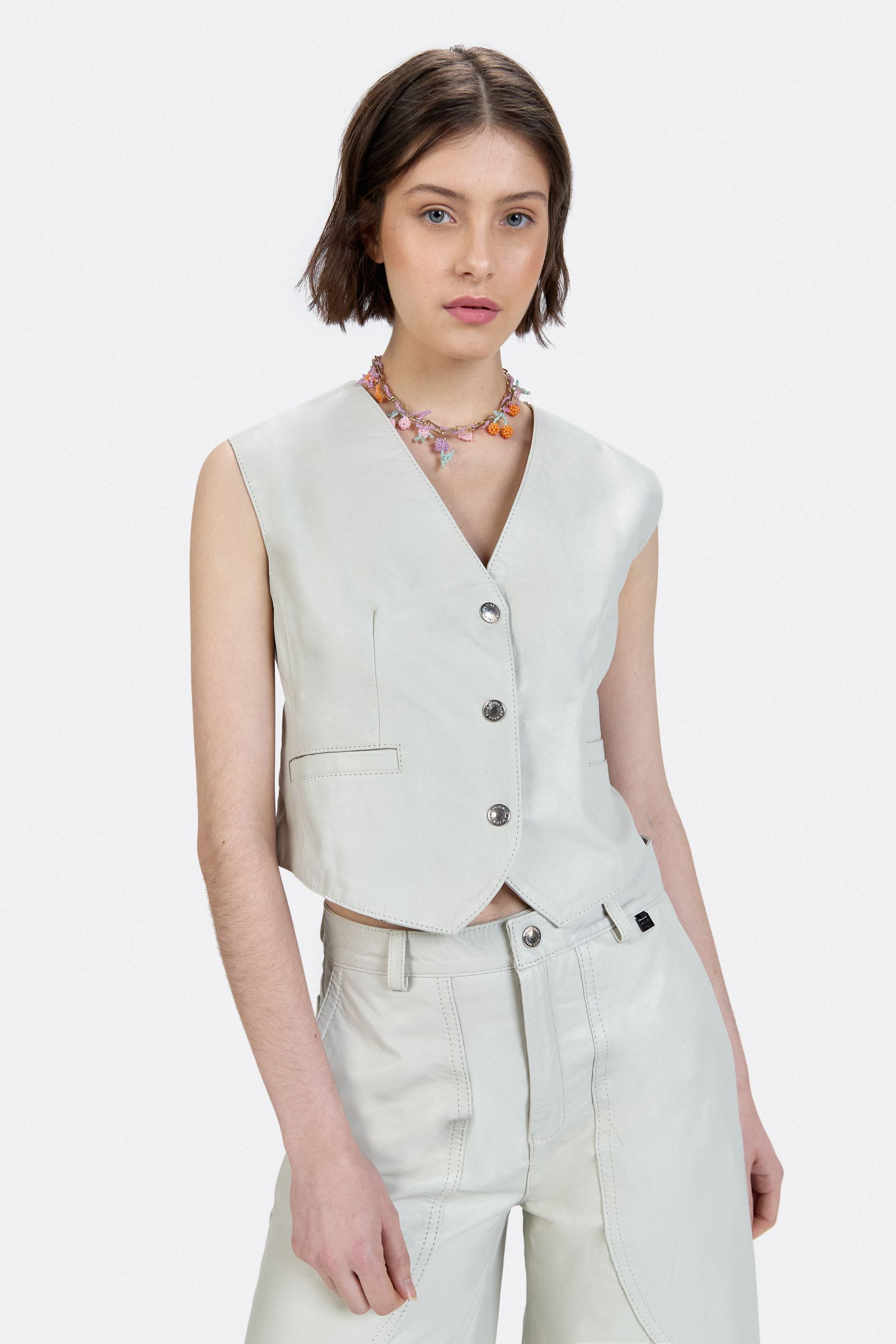 Chaleco estilo sastrero confeccionado en cuero vacuno, calidad premium. Fit regular, con hombros anchos con estructura e interior forrado en acetato personalizado. Con acceso central mediante broches snap personalizados.