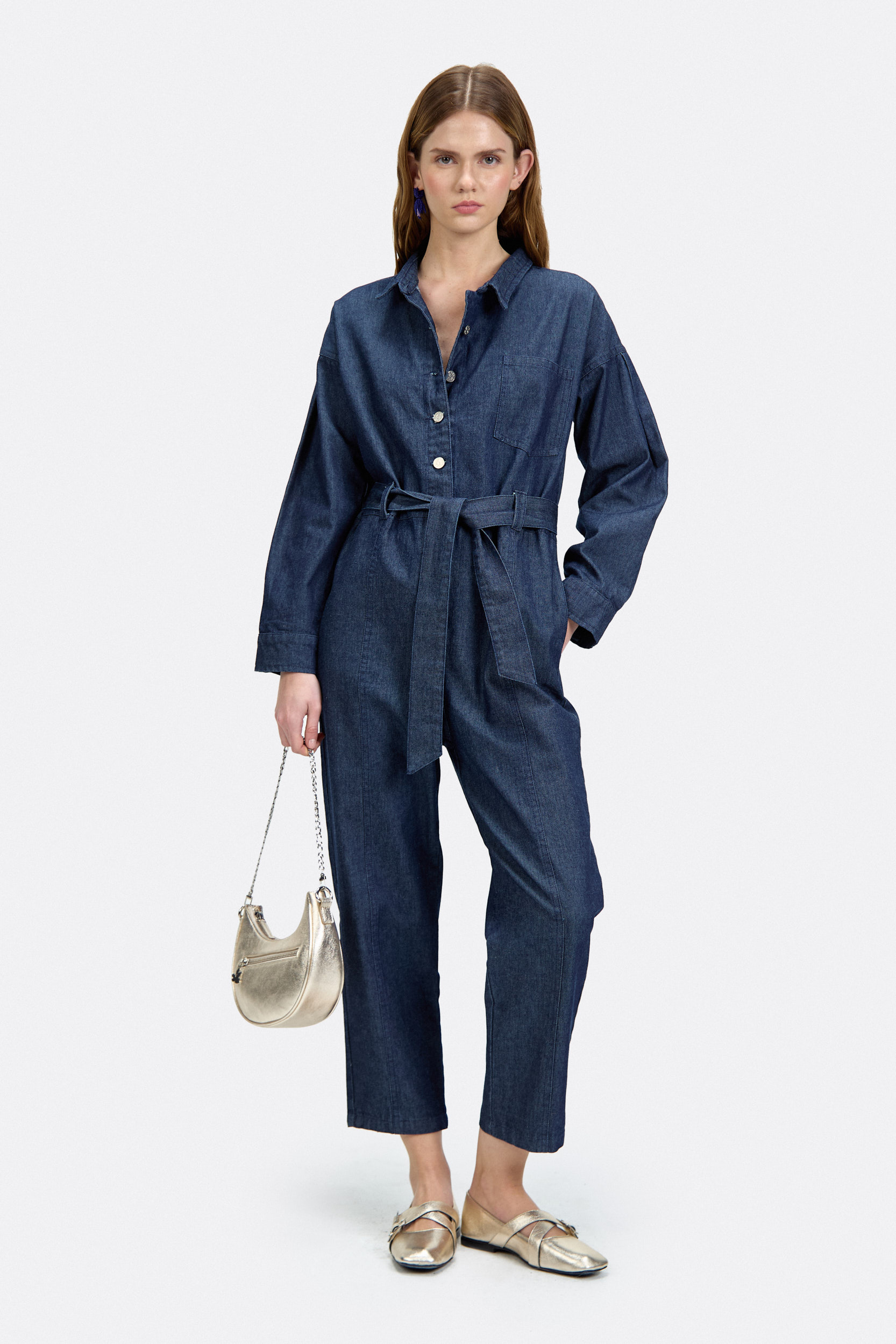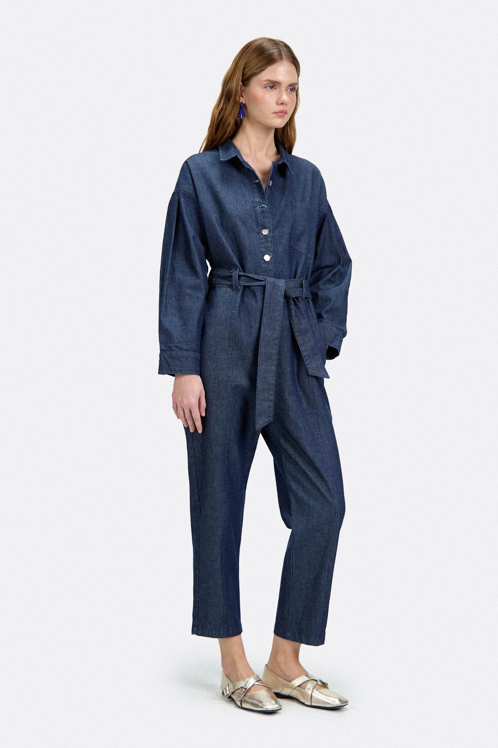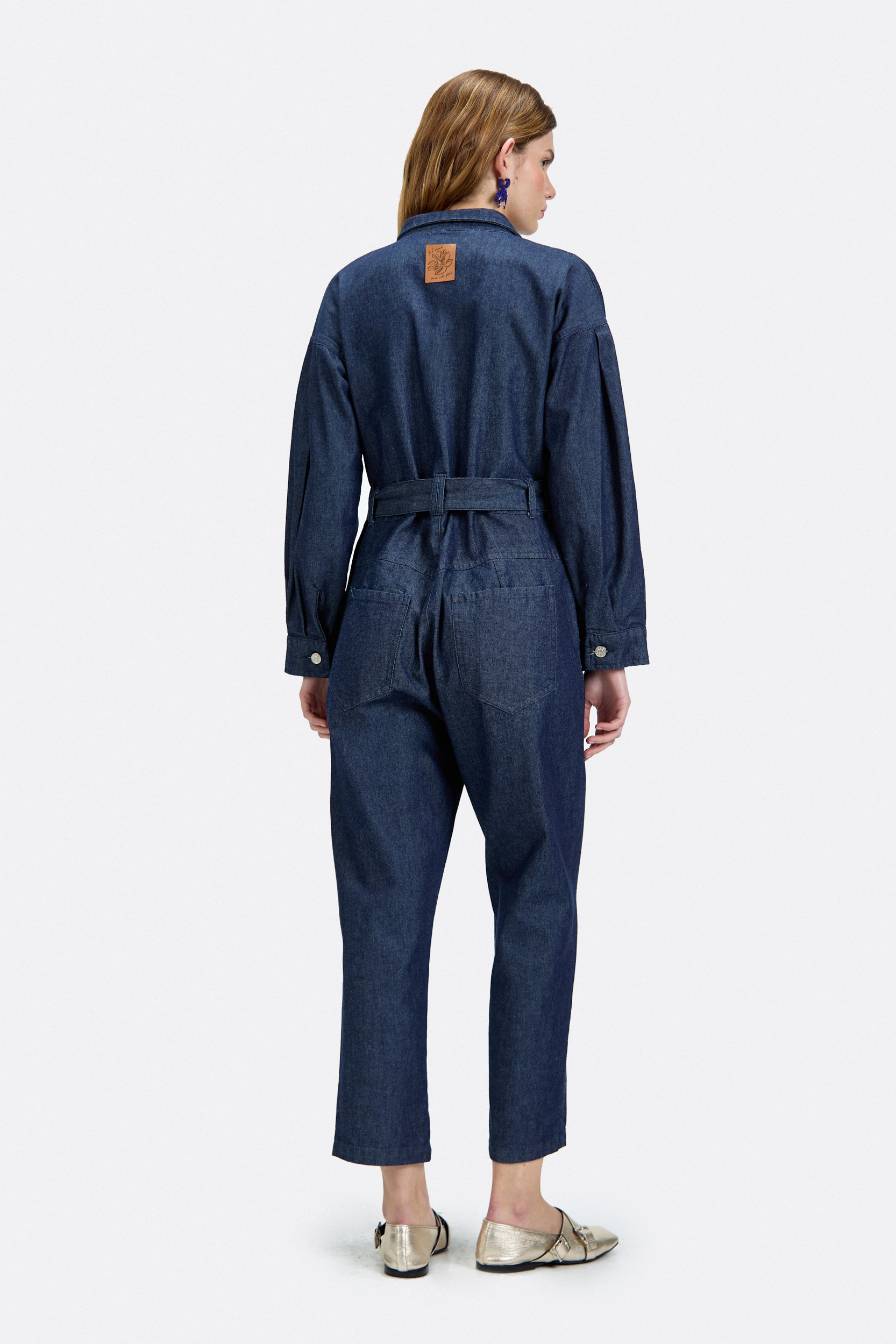 Mono confeccionado en denim 100% algodón. Fit relajado con hombros caídos y tablas sostenidas en puños. Se accede mediante cartera central con botones metálicos y lazo de ajuste en la cintura.