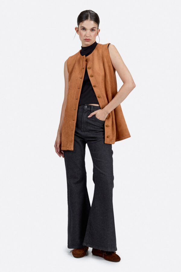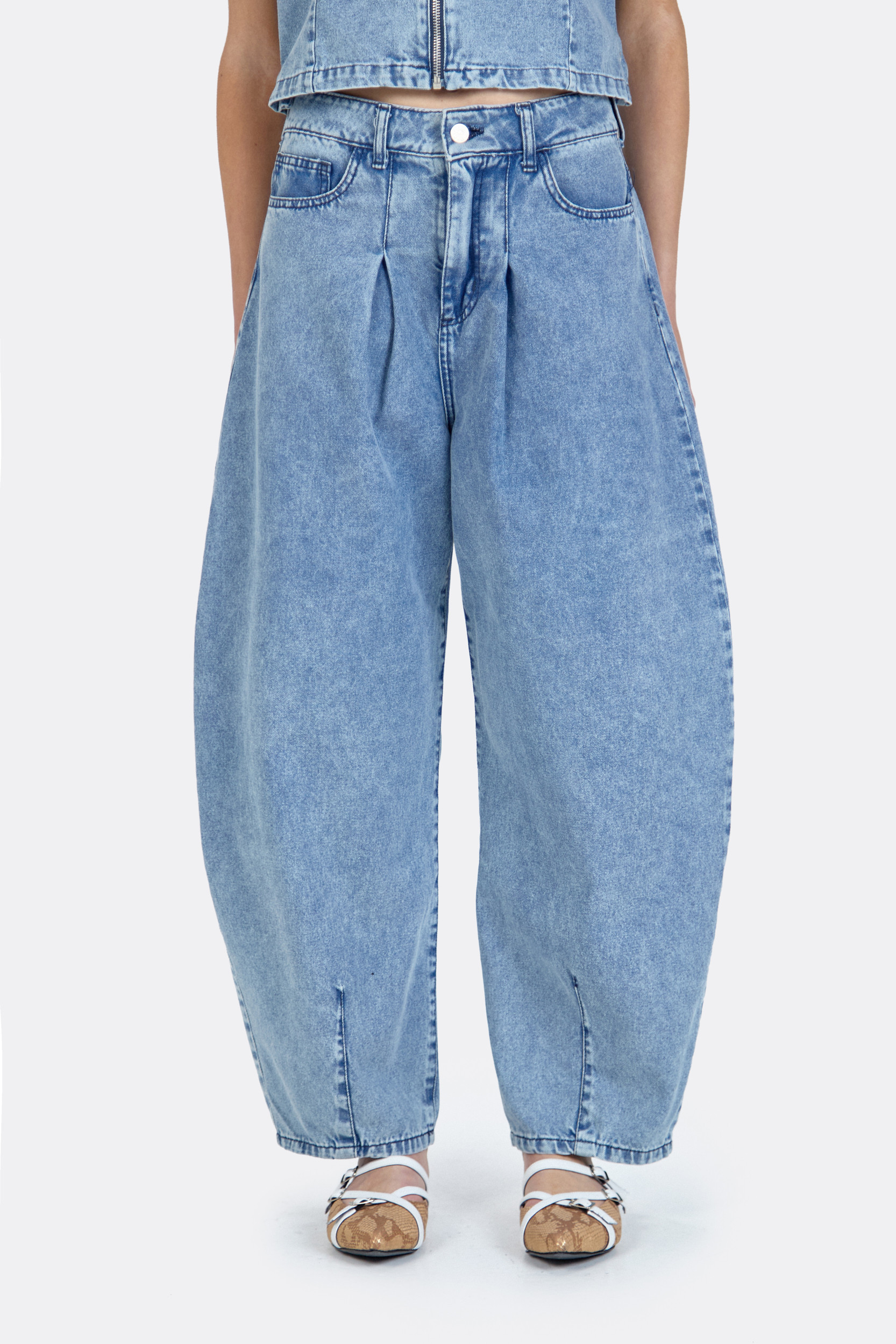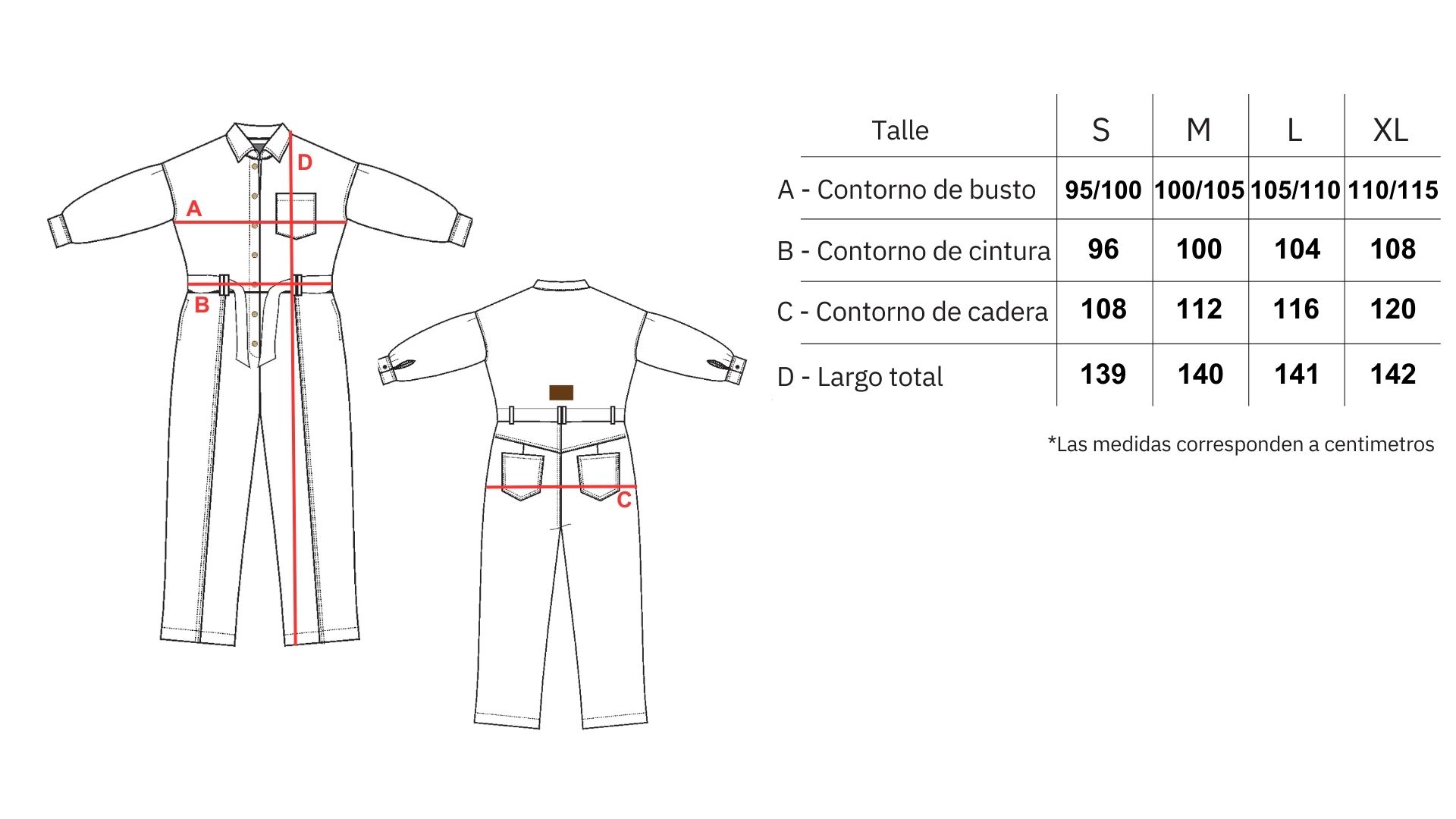 Mono confeccionado en denim 100% algodón. Fit relajado con hombros caídos y tablas sostenidas en puños. Se accede mediante cartera central con botones metálicos y lazo de ajuste en la cintura.