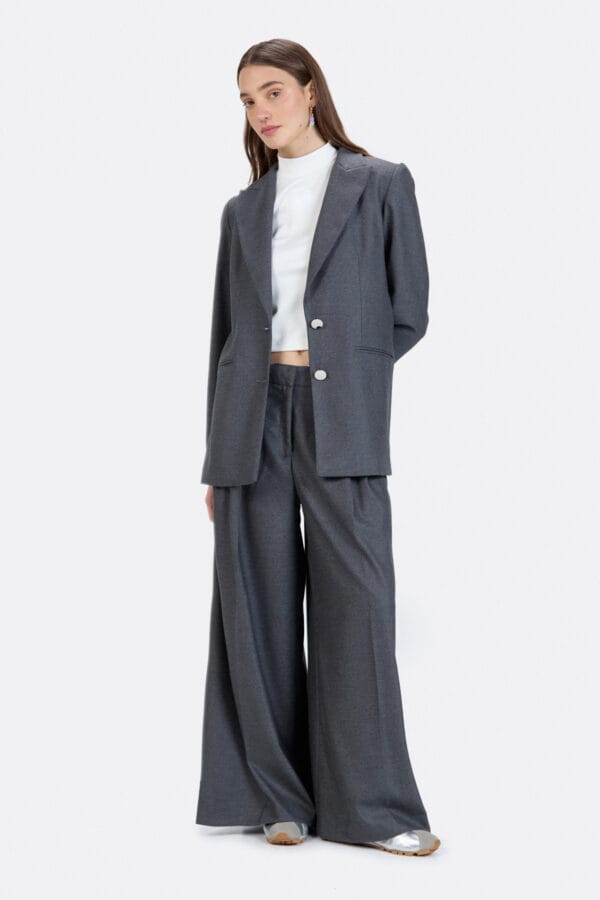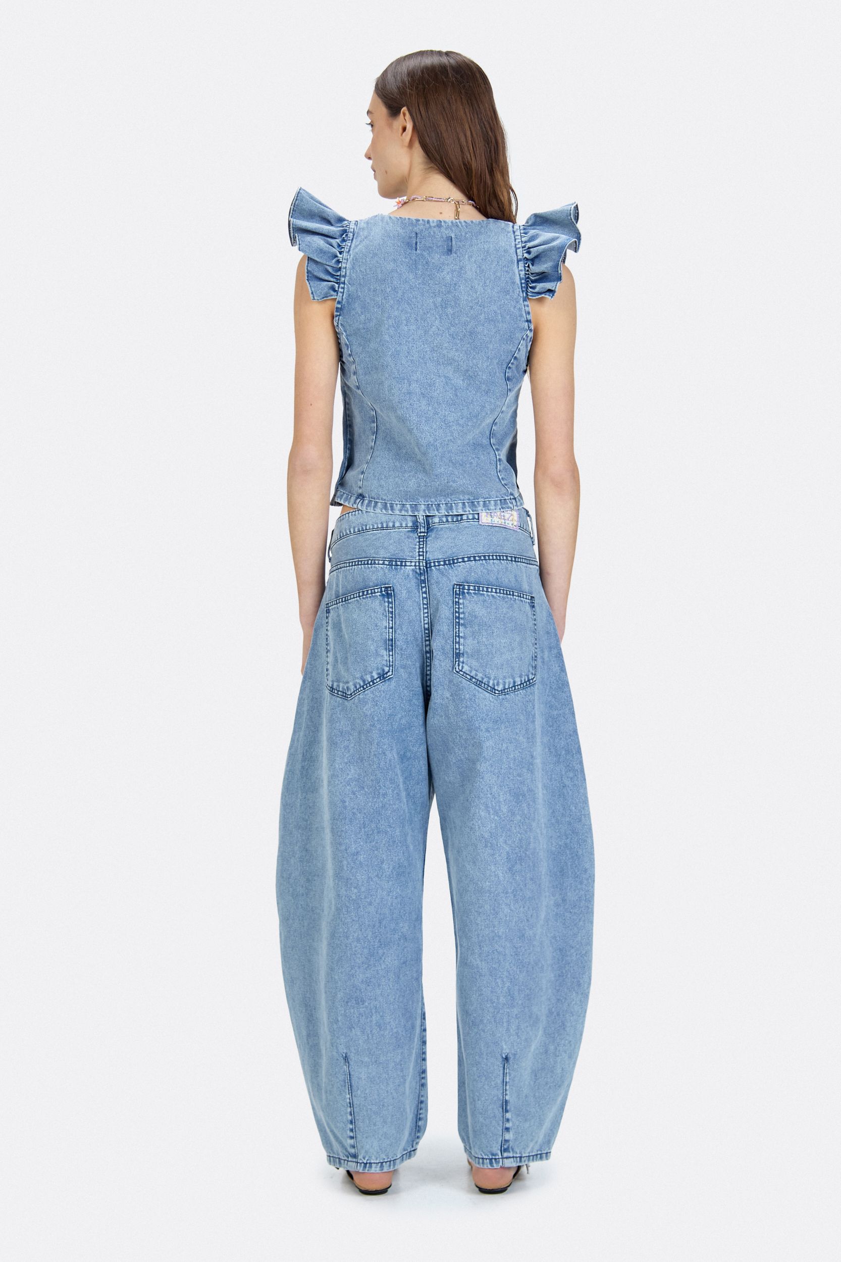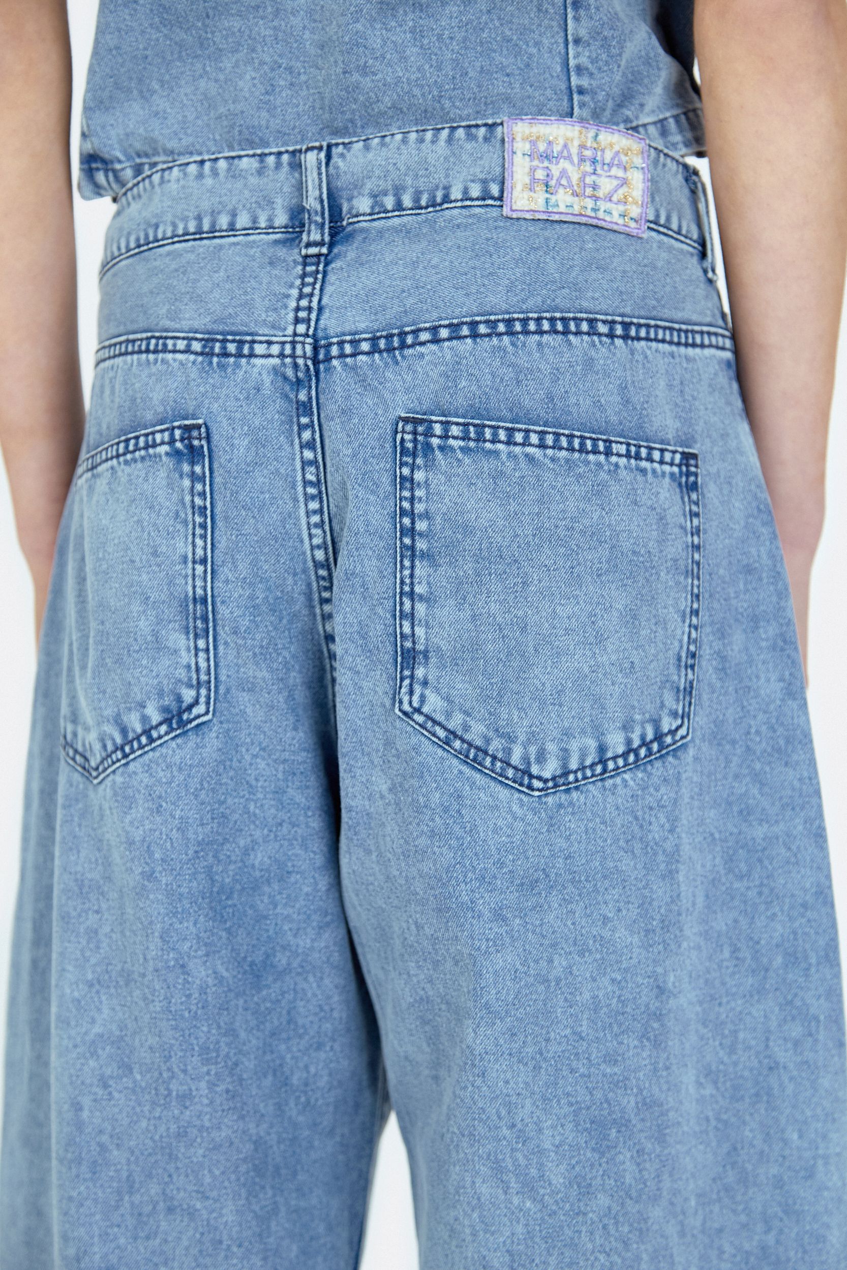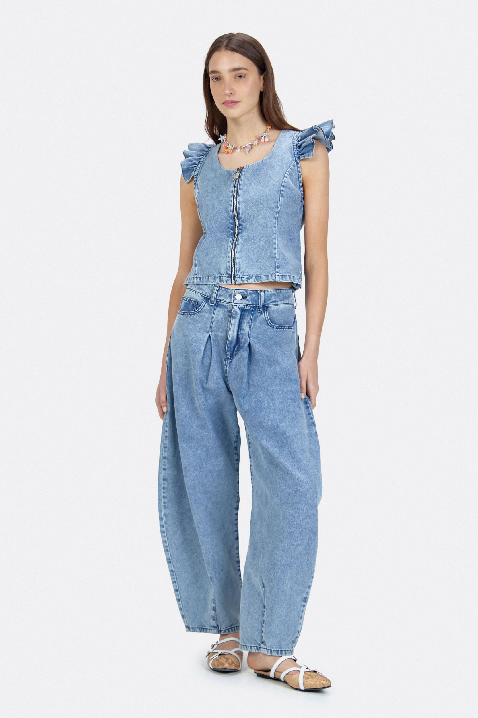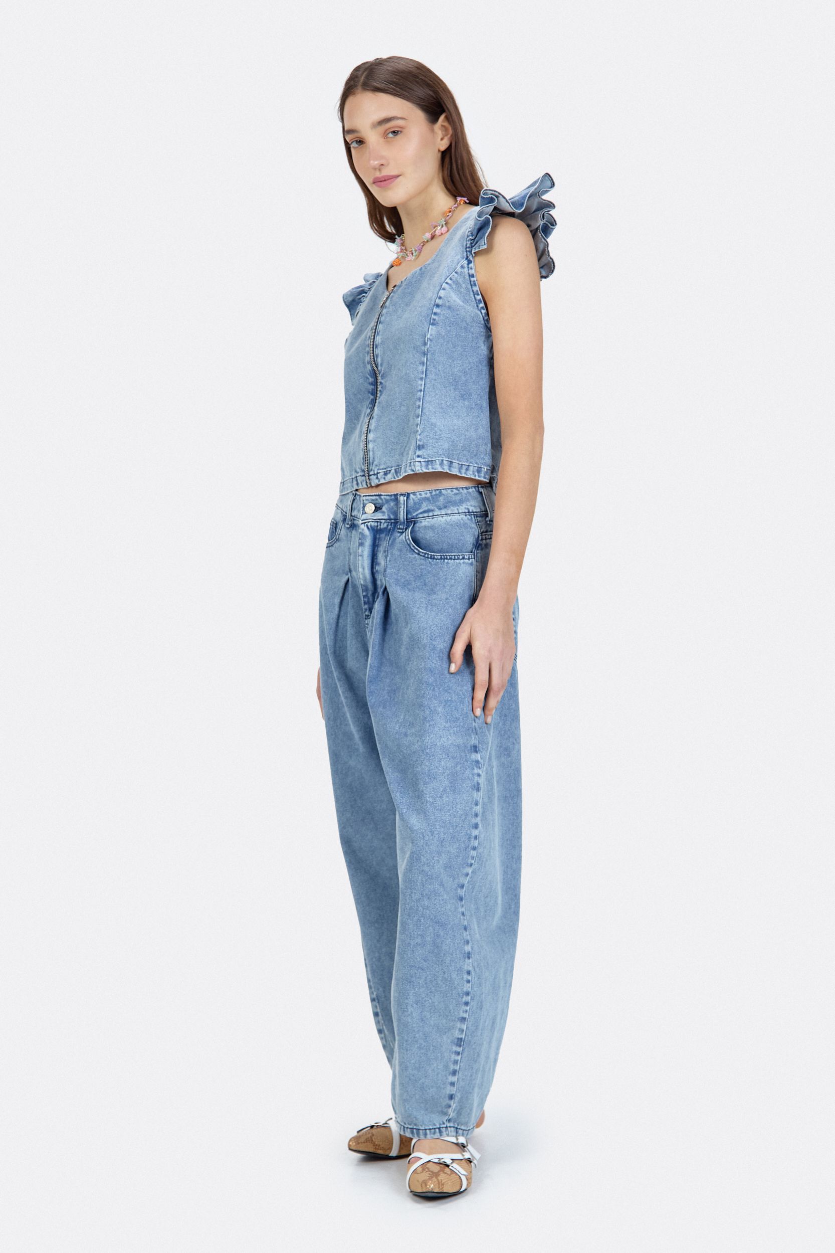 Jean confeccionado en denim de algodón. Fit barrel, con cintura media alta, pinzas en el frente, lavado azul medio y diseño 5 bolsillos. El calce es adaptable según el talle elegido y el estilo que se quiera lograr.