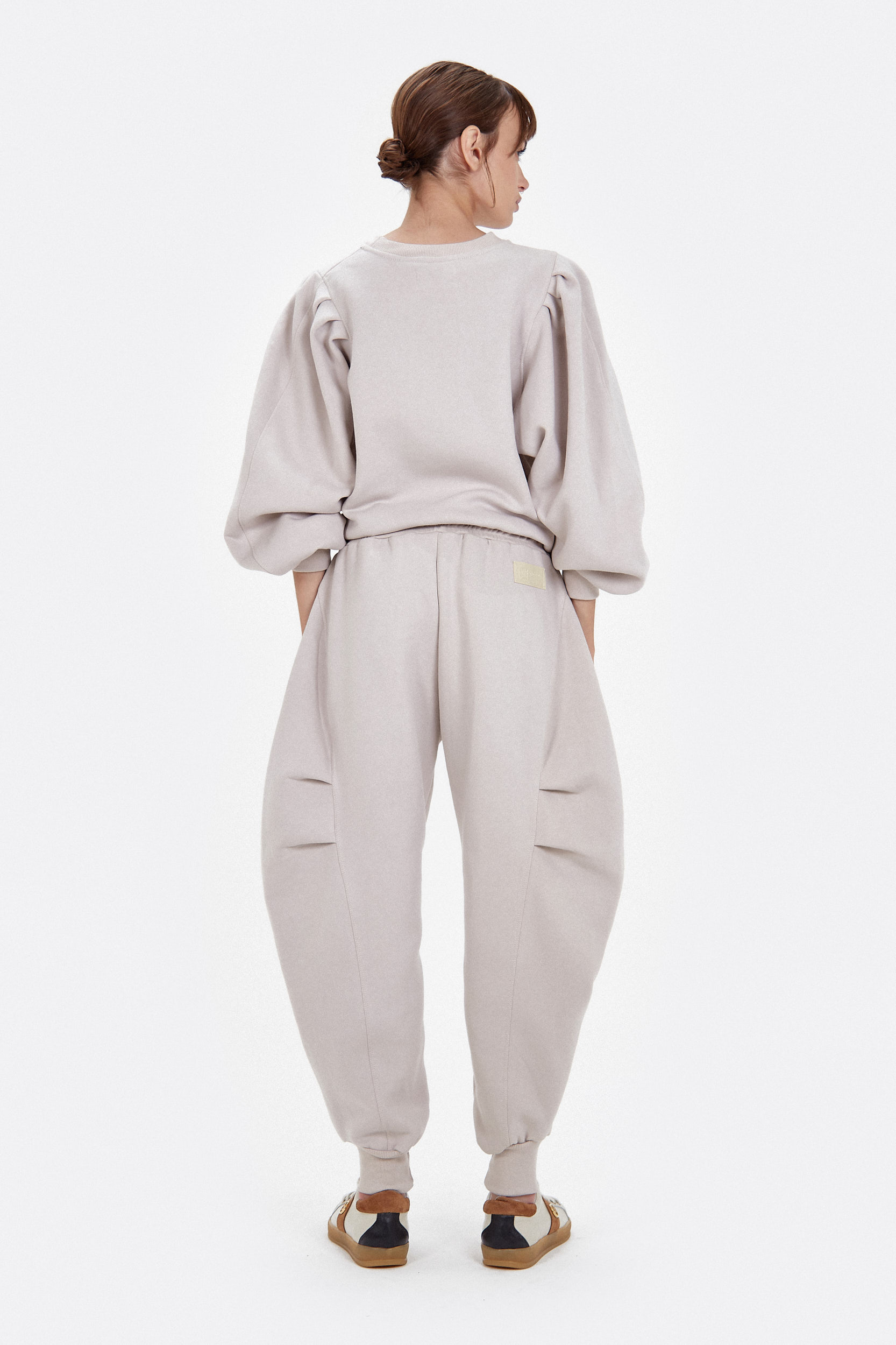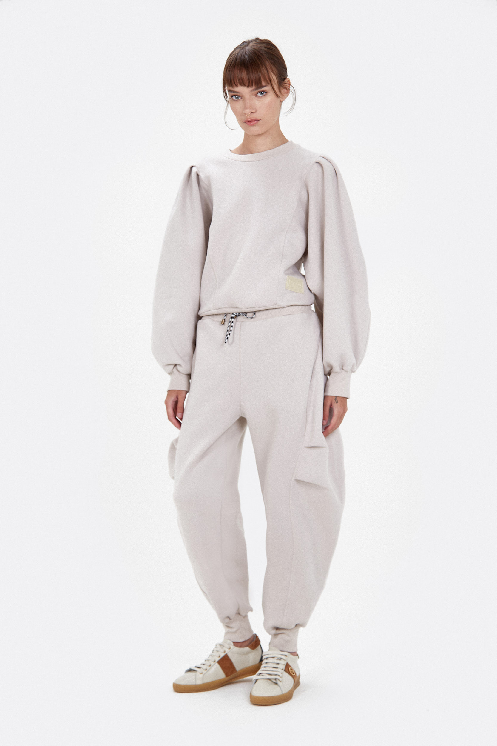 Pantalón jogger confeccionado en frisa de Algodón, tejido muy suave y cómodo. Fit balloon con puños y cintura elastizada con cordones de Algodón y terminales metálicas. Tiro alto y largo por arriba de los tobillos. En laterales lleva recortes con bolsillos y como detalle dos pinzas aplicadas estilo horizontal. Complementalo con el Buzo Élodi para un total look.