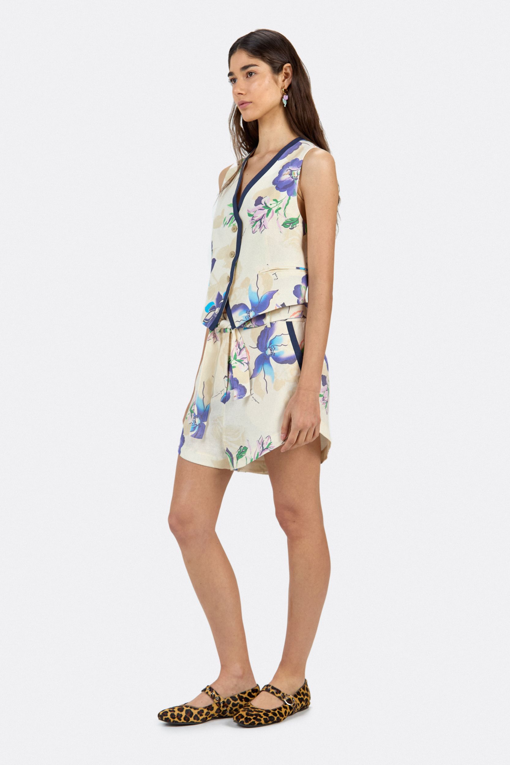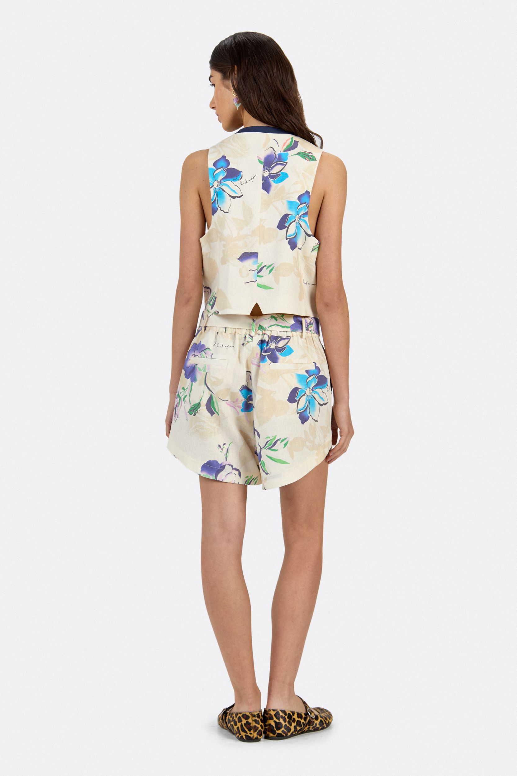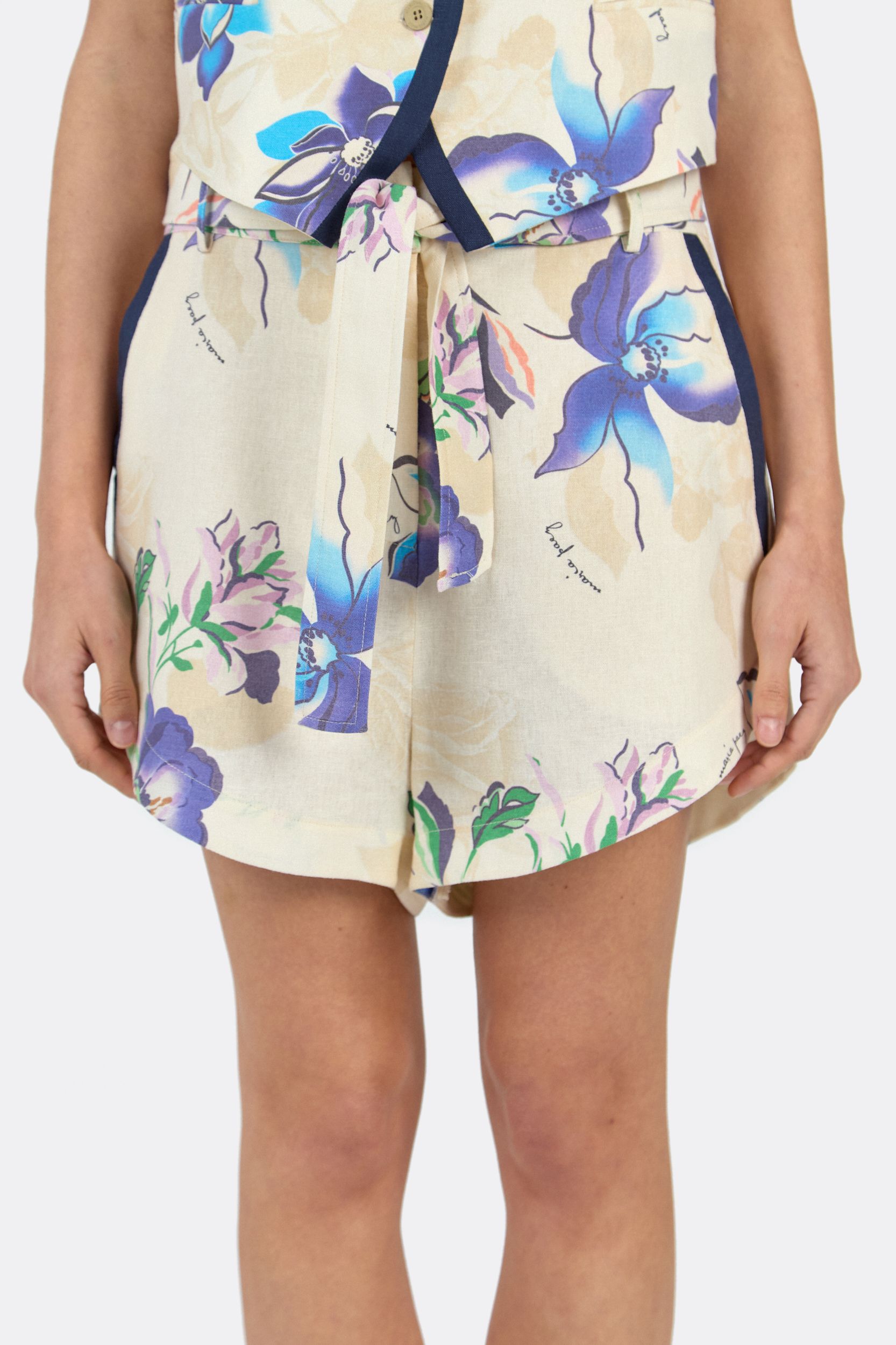 Short sastrero confeccionado en lino con print exclusivo de Maria Paez para esta colección. Fit relaxed, con ruedo irregular, lazo en la cintura con hebilla forrada al tono, bolsillos laterales con vivos a contratono y cintura con elástico en la espalda. Con acceso mediante cierre oculto y gancho pantalonero. Para un total look, complementa con el Chaleco Navy.